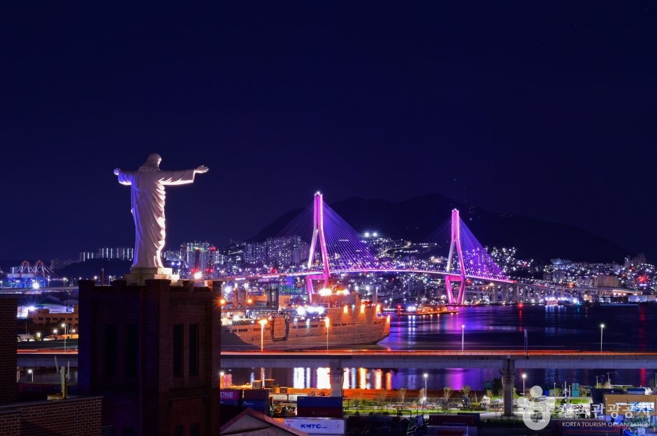 Uam-dong Urban Forest is famous for its exotic view of the Jesus Christ statue of Donghang Cathedral, which resembles the Christ the Redeemer statue in Rio de Janeiro. It offers a stunning panoramic night view of Busan, spanning the Yeongdo Sea and Busan Harbor Bridge, along with a moon installation photo zone where visitors can take striking silhouette pictures. It is a perfect place to enjoy the beautiful views, snap memorable photos, and relax in the small green forest.