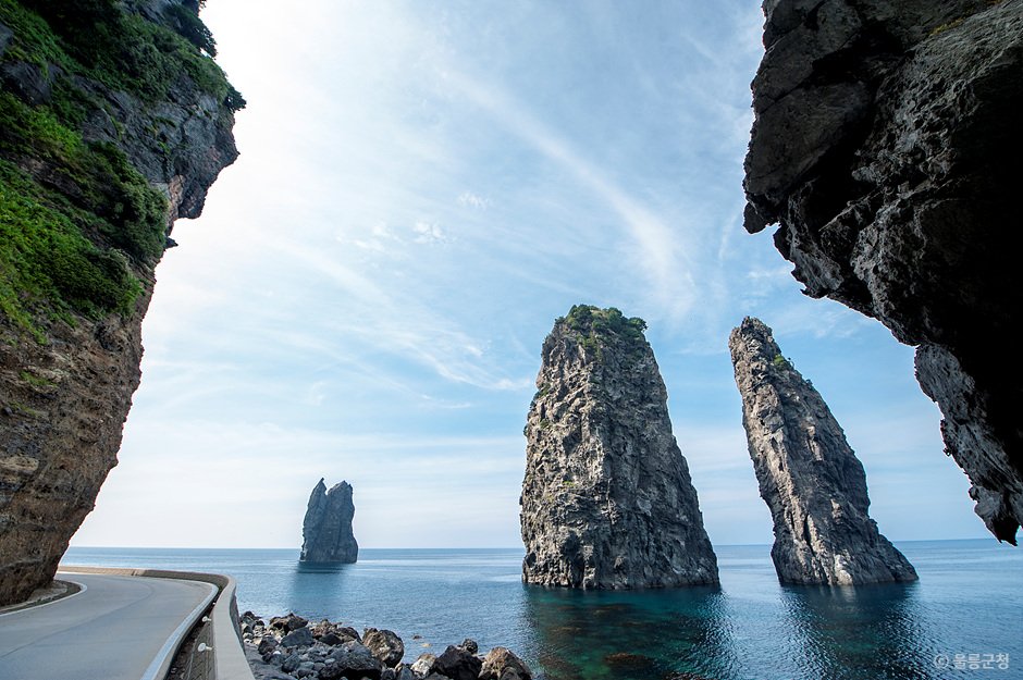 Samseonam Rocks is comprised of three rock pillars off the northern coast of beautiful Ulleungdo Island. The sea stacks were formed by waves breaking down a block of columner joints over time, leaving the three remaing stacks behind. The sides of the stacks are dotted with many holes, resembling honeycomb. The rocks name, meaning “Three Hevenly Maiden Rocks,” comes from a myth that three heavenly maidens were so enraptured by the beauty of Ulleungdo that they missed their curfew to return to heaven and were thereby punished by being turned to stone.
